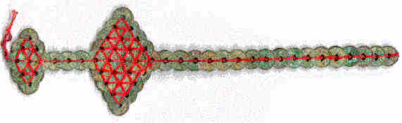 Käsch-Schwert -- gebunden aus 108 Käsch-Münzen, Länge ca. 55cm. Ursprünglich wurden diese Schwerter zur Abwehr böser Geister oder als Glückssymbol hergestellt. Inzwischen auch für Touristen/Europäer angefertigt, stellen sie eine interessante Bereicherung jeder Münzsammlung dar. Die Münzen sind Originale (ca. 1300 Jahre alt, gebunden wurden sie aber während der letzten Jahre).