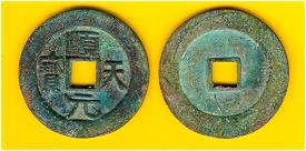 Tang-Dynastie Kaiser: Kao Tsu (618 - 626) Rückseite mit Nagelmarke (der Kaiser soll bei seinen Inspektionen der Gießerei in einige frische Lehmformen seinen Fingernagel gedrückt haben) |