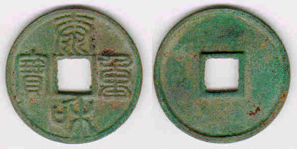 10 ch'ien (Käsch) Kaiser: Chang -Tsung Epoche: T'ai Ho (1201-1208) Vorderseite: T'ai Ho Chung Pao (große Siegelschrift) Rückseite: leer vgl. SCHJÖTH 1093